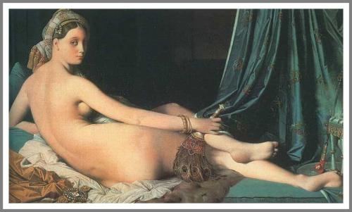 半身を大きく捻り振り返る裸身の女性。肩から腰への曲線は、なめらかさを強調するように表現され「実際よりも脊椎骨3つ分体が長い」との批判さえともなった事で有名な、アングルの「グランド・オダリスク」です。
